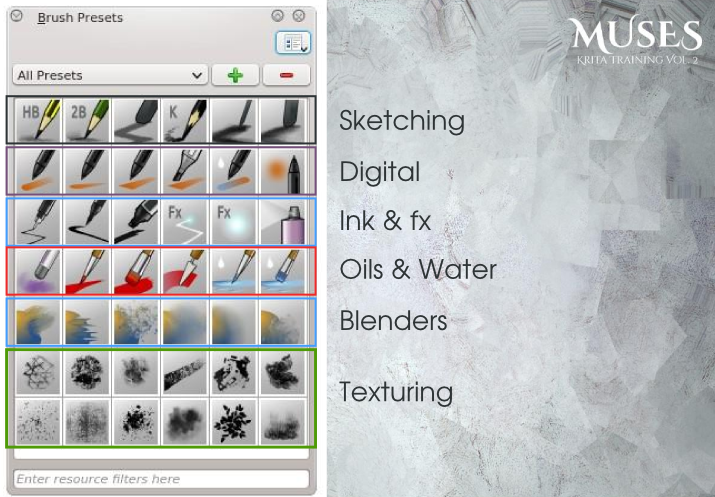 To install, download the file, unzip , then import it in Krita this way : go to menu Settings/Manage Ressources / Import Bundle/ then look for your "muses.bundle" and click okLicense : the brushkit itself and thumbnails is released under the WTFPL 2.0 (compatible with Public Domain and CC-0 ).
